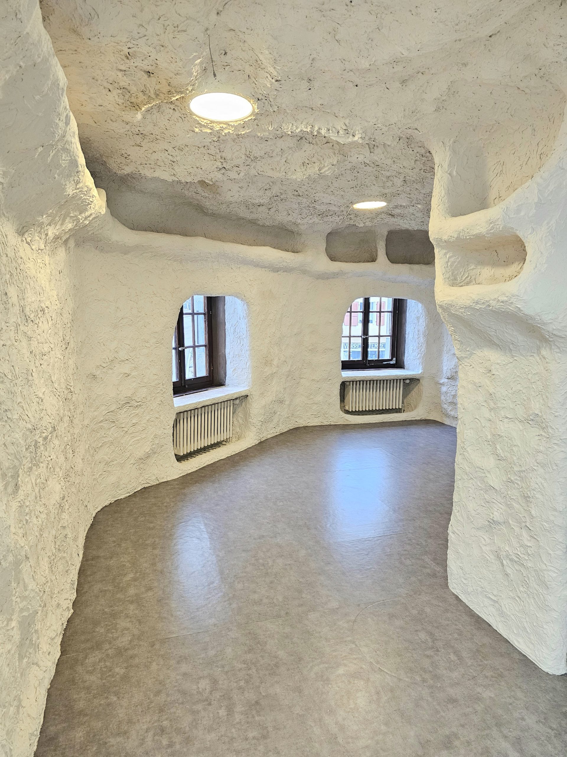 Le bâtiment se distingue par son architecture en pierre avec une façade blanche élégante, agrémentée de grandes fenêtres et d'une entrée avec porte vitrée.